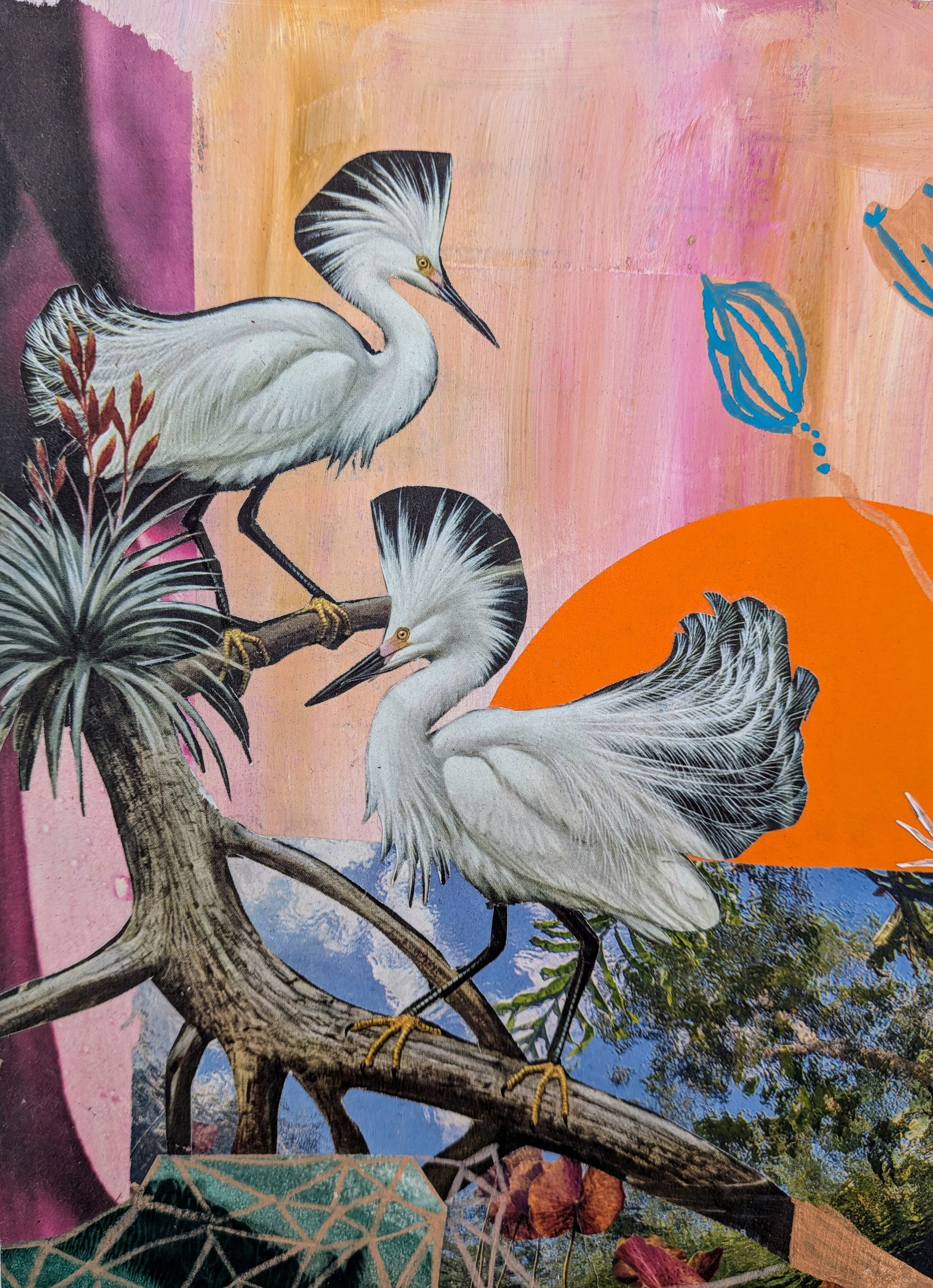 Measuring 9x12," Dreamscape I and its companion piece Dreamscape II are both made from acrylic and acrylic gouache paint with collage on cradled wood panels. Dreamscape I features snowy egrets and other found imagery with details added using gel pen and colored pencil. It is wired on the back to hang.