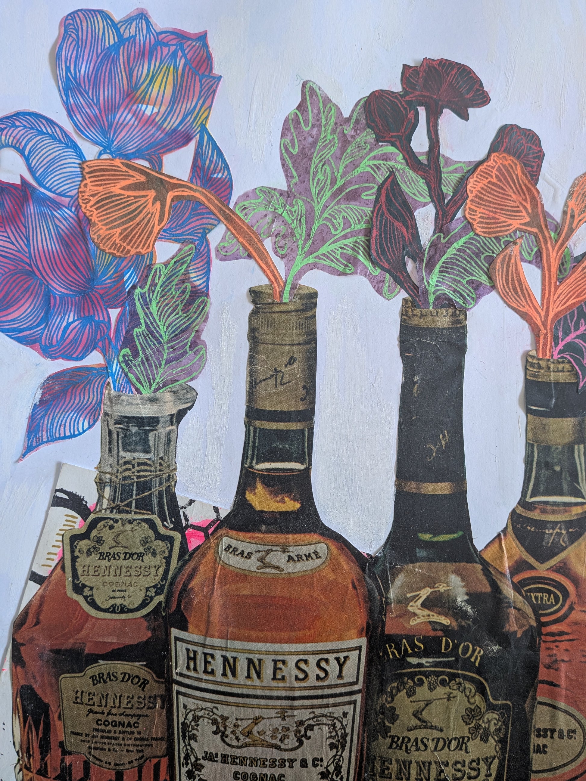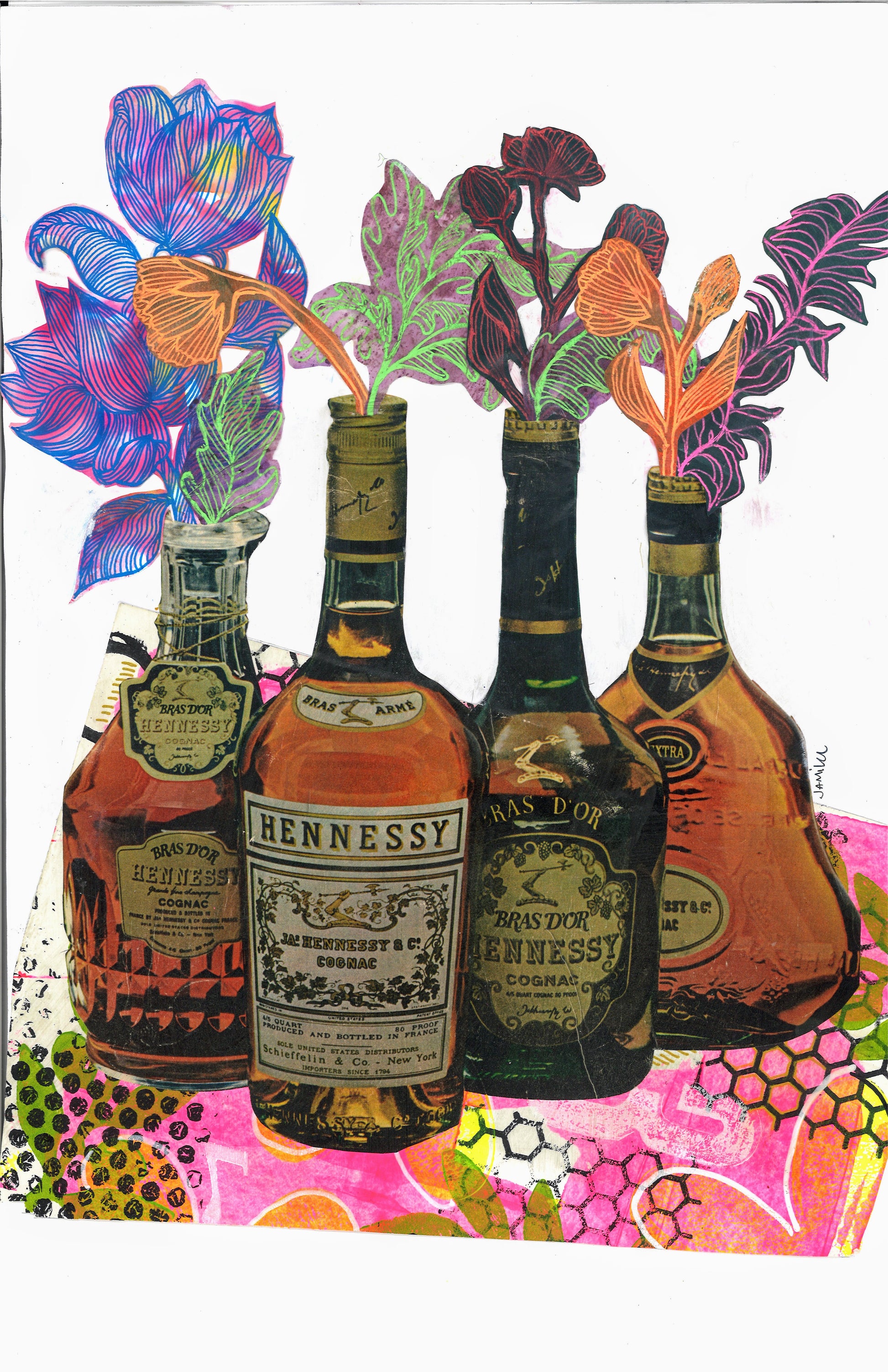 Flowers and Hennessy (11x15" mixed media collage, original)